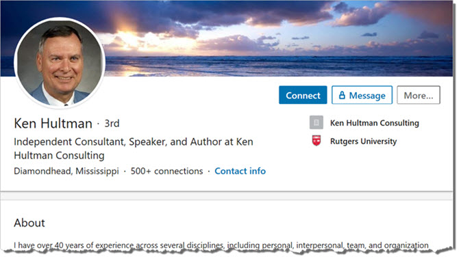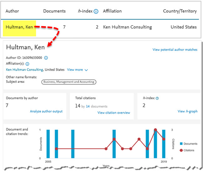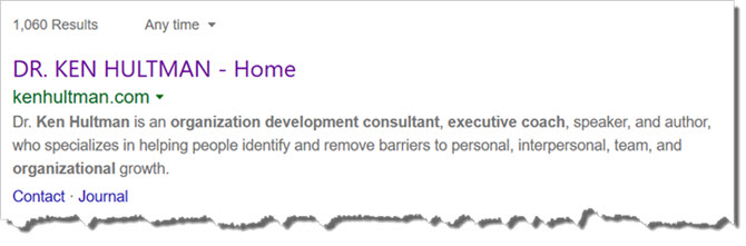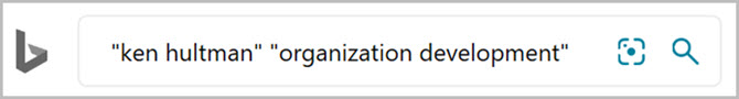 The image below shows a Bing search for information about Ken Hultman, the author of the article shown in the previous section. Since the author has a relatively common name, the phrase "organization development" (Hultman's area of expertise, per the biographical information included in the article shown in the previous section) was also added to the search to help ensure that search results are for the correct author: