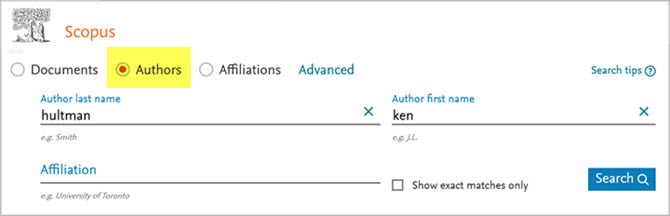 Once in the database, click on the Authors link above the search boxes and enter information about the author in the search boxes, as shown in the image below: